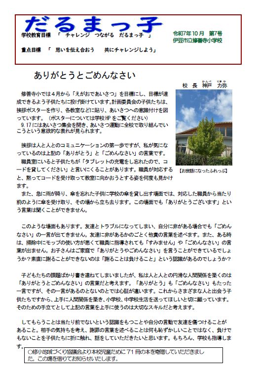 修善寺小では4月から「えがおであいさつ」を目標にし、目標が達成できるよう子供たちに投げ掛けています。計画委員会の子供たちは、挨拶ポスターを作り、各教室などに貼り、あいさつへの意識付けを図っています。(ポスターについては学校HPをご覧ください)9.17にはあいさつ集会を開き、あいさつ運動に全校で取り組んでいこうという意欲的な表れが見られます。挨拶は人と人とのコミュニケーションの第一歩ですが、私が気になっているのは上記の「ありがとう」と「ごめんなさい」の言葉です。職員室にいると子供たちが「タブレットの充電をし忘れたので、コードを貸してください」と言いにくることがあります。職員が対応すると、黙ってコードを受け取って教室に向かおうとする姿を何度も見かけます。
