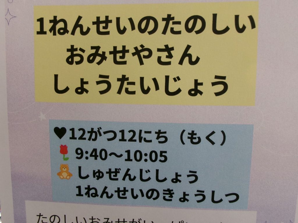 12/12 ようこそ修善寺小へ 2024年12月12日 sses_admin Leave a comment 1年生が生活科の授業で学んだことを生かして「たのしいおみせやさん」を作りました。 お隣の修善寺保育園の年長さんを招待し、一緒に遊びました。分かりやすい説明したり、 一緒に遊んだりしながら、楽しい時間を過ごすことができました。