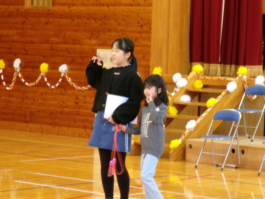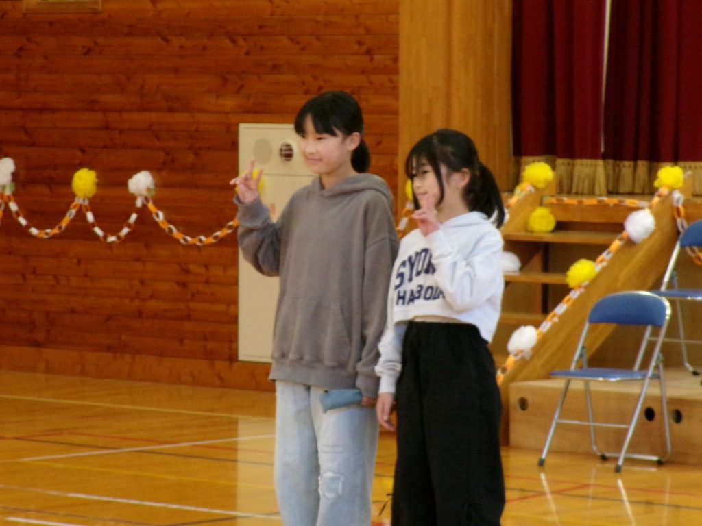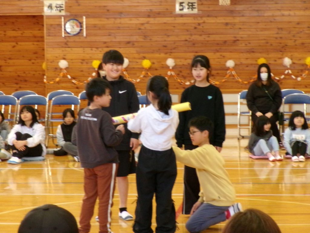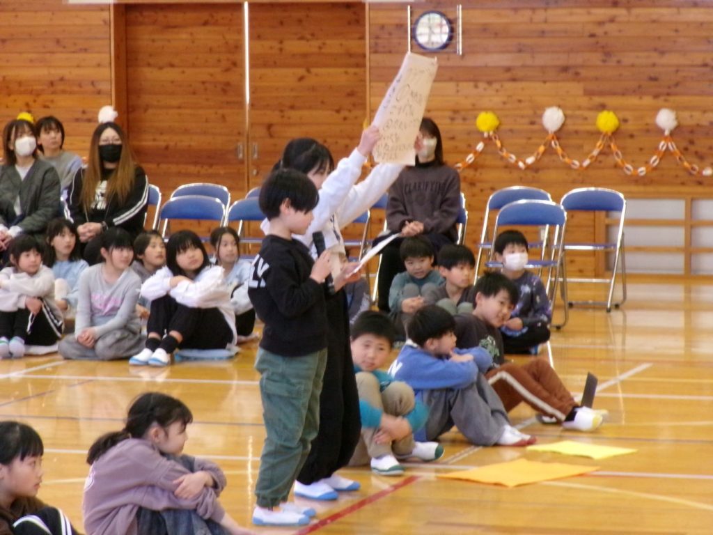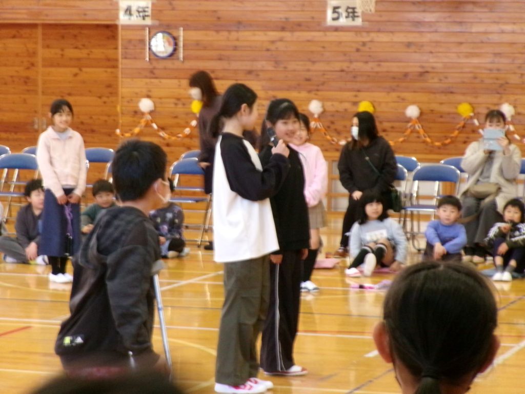 体育館にて6年生を送る会を行いました。4年生のチャレンジから始まり、歌・エール、クイズなどいろいろな出し物で6年生への感謝の気持ちを伝えました。どの学年も6年生への感謝の気持ちが表れた出し物でした。1年間、だるまっ子のリーダーとして活躍してくれた6年生、お疲れ様でした。